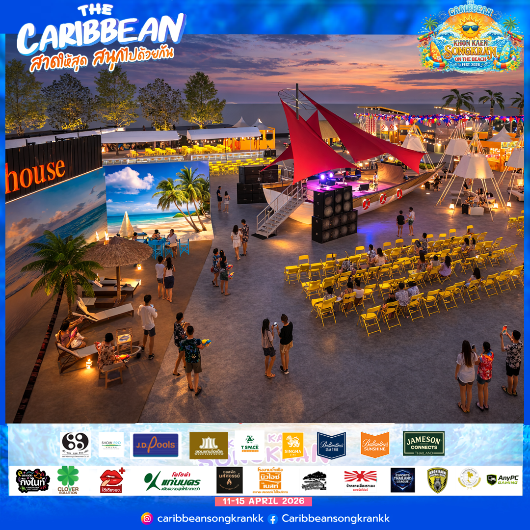 เตรียมพบกับปรากฏการณ์ใหม่ "The Caribbean Khon Kaen Songkran on the Beach Fest. 2026" เนรมิตพื้นที่ใจกลางเมืองให้กลายเป็นชายหาดสุดมันส์ จัดเต็มแสงสีเสียงอลังการระดับมืออาชีพ พร้อม Check-in Landmark เรือโจรสลัด และ ประภาคาร ที่ให้บรรยากาศ The Caribbean แบบจัดเต็ม!